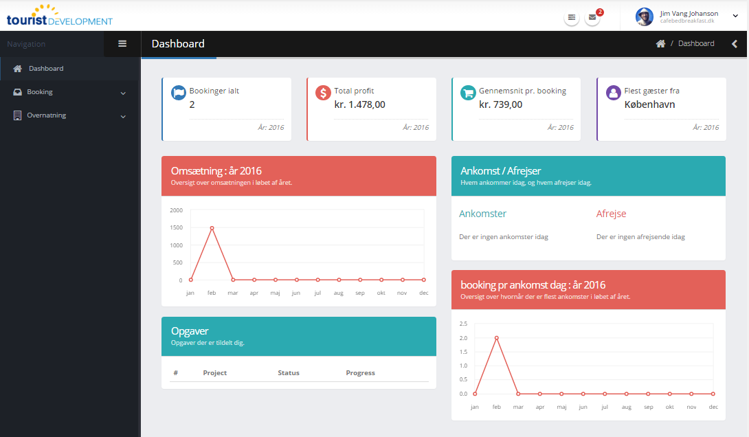 Det første du ser når du er logget ind, er en informationstavle eller et dashboard, som det også kaldes. Dashboardet tilpasses din type overnatning og viser dig relevant information om booking, ankomster, opgaver, omsætning osv. Desuden har du en menu i venstre side, som også tilpasset til dig, alt efter hvilke dele af booking systemet du benytter.