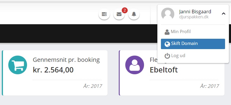 Har du flere hjemmesider(domæner), som du betjener gennem Guestbox Bookingssystem, kan du her skifte imellem dem. Klik på dit navn i øverste højre hjørne – for at se rullemenuen, hvor du vælger ”skift domæne”.