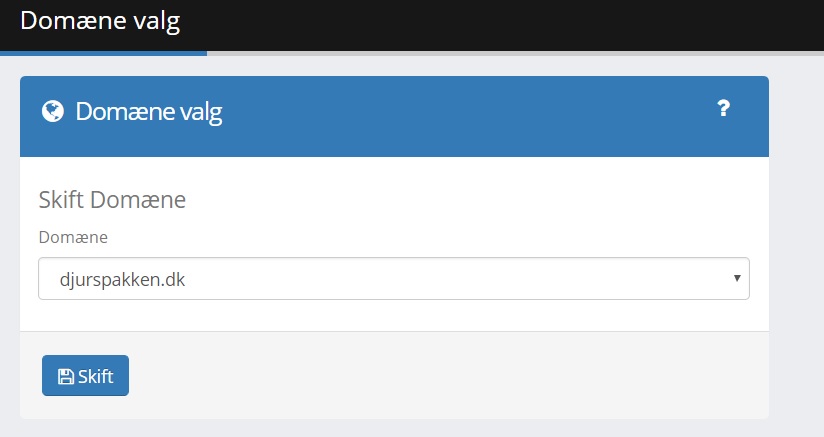 En ny side kommer frem og du har nu mulighed for at skifte mellem dine tilgængelige domæner. Vælg det du ønsker at arbejde med og klik ”skift”. Vær OBS på, at hvis du kun har ét tilgængeligt domæne, vil rullemenuen være tom!