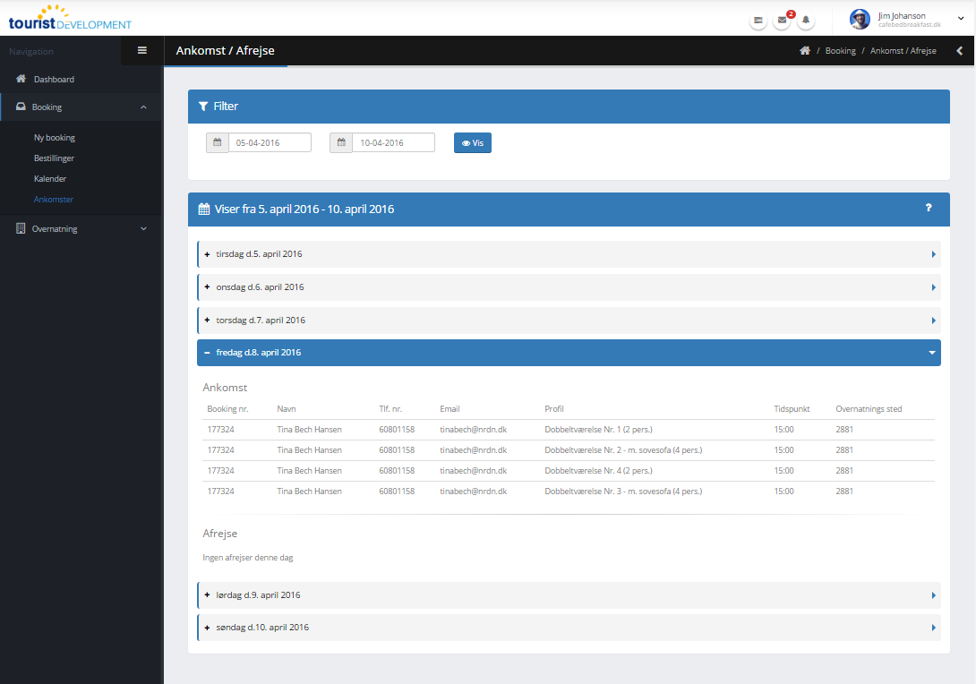 Oversigt over bookinger. Du kan filtrere på ønskede datoer fx 5/4 – 16 til 10/4 - 16, for at se bookinger foretaget i perioden. Herefter er der mulighed for at klikke sig ind på de enkelte dage og se henholdsvis adkomster og afrejse.